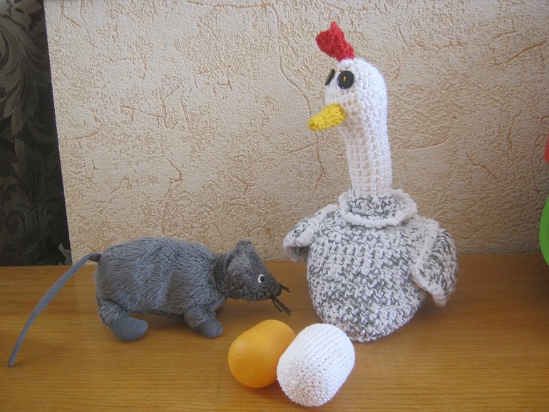 Мы курочкой просто играем, особенно в сказку Курочка-Ряба. Есть у нас и яйца (обвязанные цилиндры от киндеров) и гнездо, и даже цыпленок, но он из ткани.