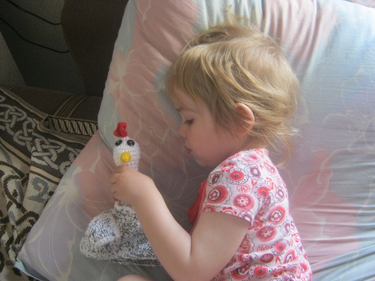 Высота курочки около 19 см без гребешка. Полина сказала, что будет спать с курочкой и по-дружески так держит ее за шею)