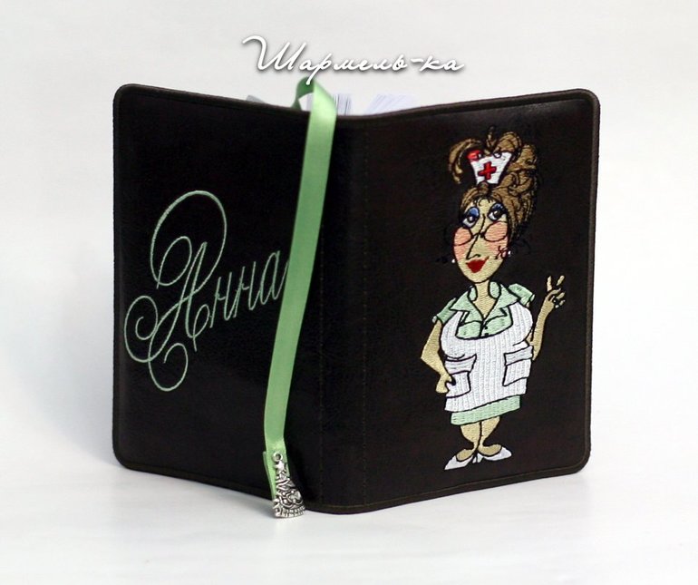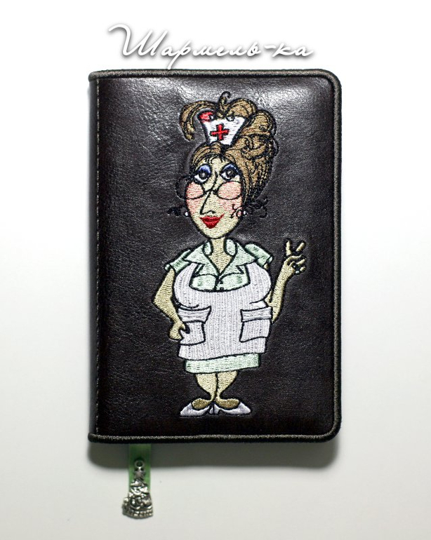 Вышитая обложка для блокнота (съемная, с блокнотом) "Проходите, раздевайтесь, ложитесь!" с очаровательной барышней-медиком
