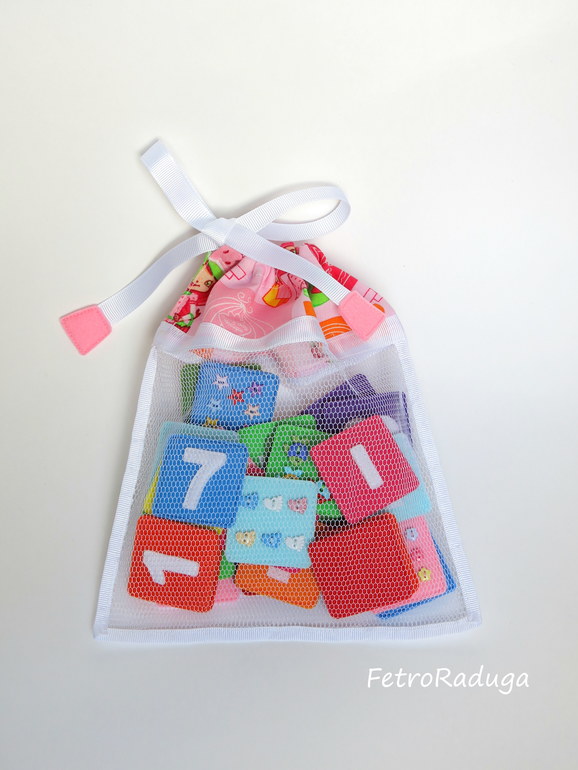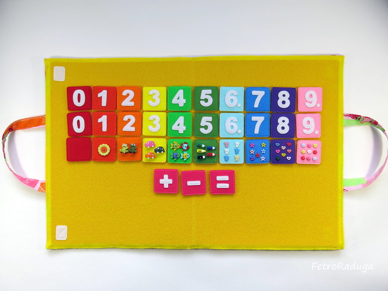 В этот раз так же как и здесь в наборе 33 карточки на липучке, 20 карточек с цифрами от 0 до 9 по 2 шт., 10 карточек с пуговками и 3 карточки - знаки. Размер карточек 4*4 см. Изменилось совсем немного - возле цифр 6 и 9 ещё точки пришила, чтобы не путались где какая цифра, и вместо пуговок-уточек пуговки-рыбки, вот и все отличия)))