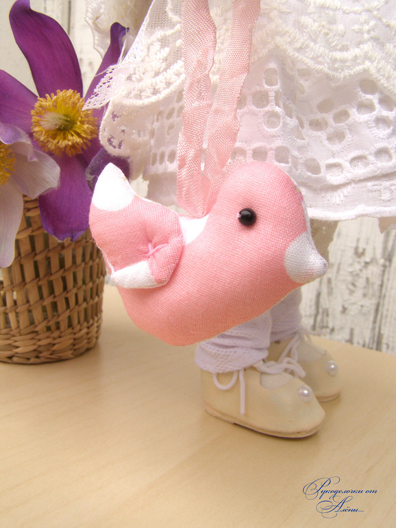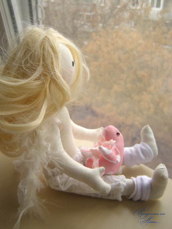 Моя новая куколка очень простая...но я к ней как-то прониклась особо. Ох...как же мне хотелось...аж не "моглось".. нарисовать ей огромные серые печальные глаза. Но заказ есть заказ, куколка для маленького ребенка, потому глазки вышиты, волосы крепко пришиты, а одежка вся съемная). Стоит и сидит самостоятельно.За спиной у неё кружевные съёмные крылышки. Ростик около 30см...мой любимый размер у куколок.