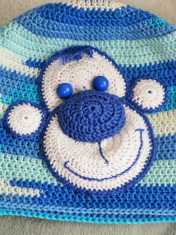 Такая позитивная шапулька и сынышке очень идет. На первый взгляд я подумала, что если бы не рот- похоже больше не на обезьянку , а на пингвина.