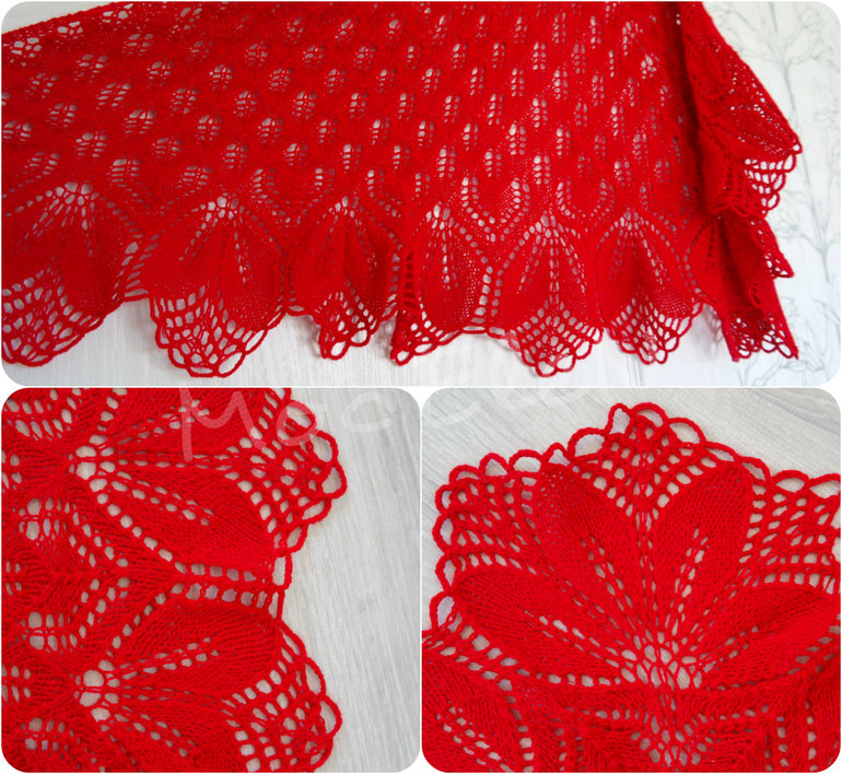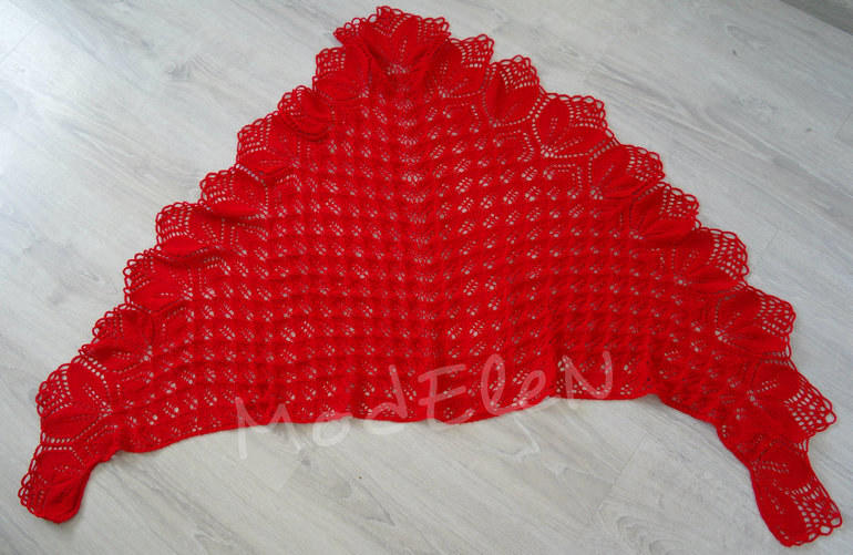 Связалась ещё одна шаль "Харуни",но уже шального размера(170см -разлёт и высота 87см) и однотонная.Вязалась для тёти,которая обожает красный цвет.Пофотать толком не удалось утром довязала,а вечером упаковать уже нужно было,хорошо тепло и за день она высохла)))