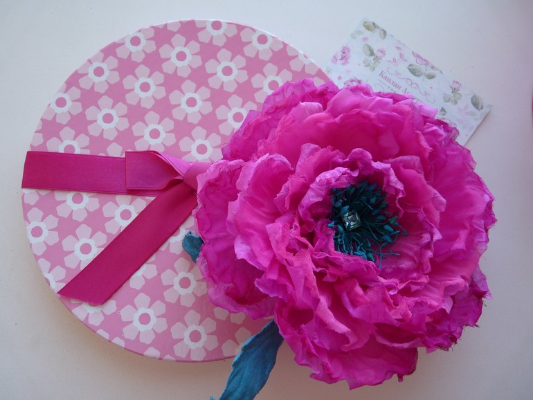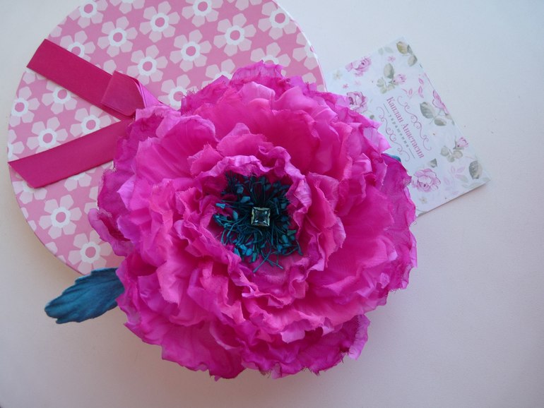 Эта красота - плод кропотливой работы. Ткани все красились, затем обрабатывались специальными инструментами и окончательная сборка. Не смотра на большой размер цветка, он получился довольно лёгким:-)