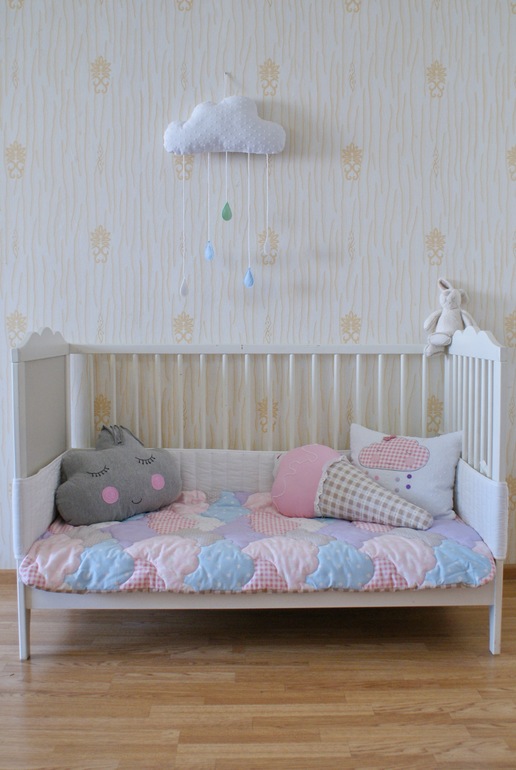 Пэчворк и квилтингВсем привет) сегодня покажу вам воздушный и нежный комплектик в детскую кроватку "Облака". Состоит он из простеженного одеялка и 3 декоративных подушек. Ну тут еще и моя юная модель засветилась))))