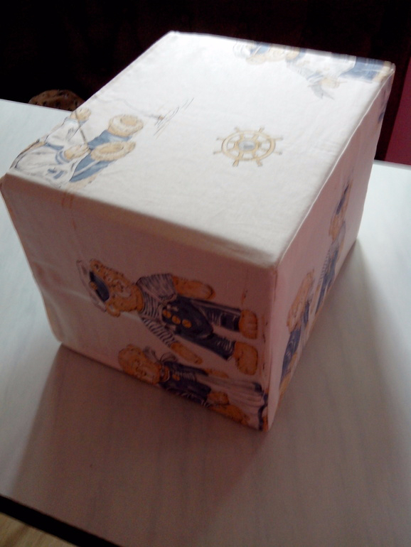 Заморочка: вот я с ней намаялась то))) Была у меня ткань, но она просвечивала картинки на коробке, я коробку расклеила, вывернула на другую сторону и проклеила вновь, ночь она стояла в "корсете". Потом до меня дошло, что внутри то она все равно просвечивает)) Ну и ладно... переспав с этой мыслью ночь, я все таки решила найти в закромах ткань поплотнее, на что была распущена наволочка (одиночная без набора и не использовавшаяся).