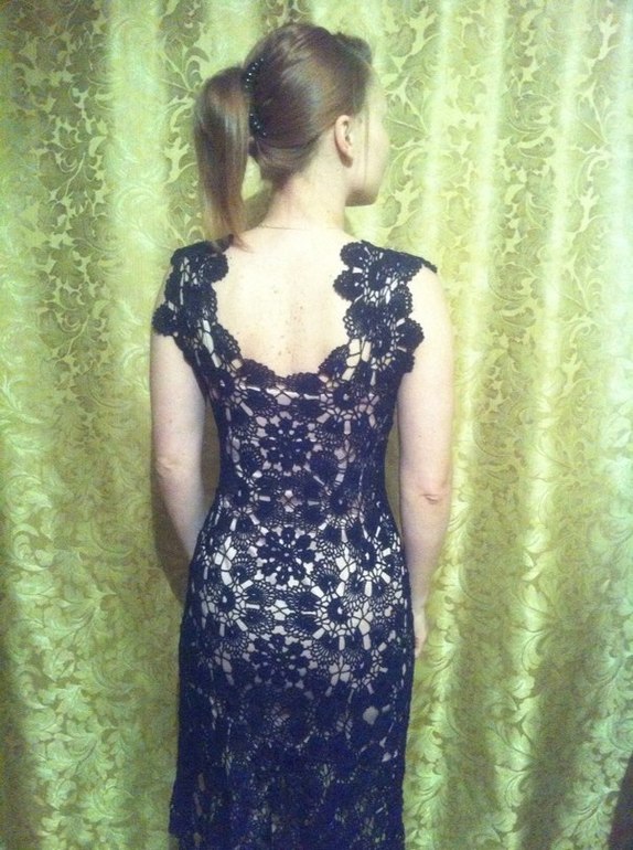 вот первый его "выгул")))здесь ещё нет мотива на груди.его я решила до вязать, после того как пол вечера промучилась ,подтягивая отвисающее платье на место(((( платье постоянно сползало,оголяя половину груди