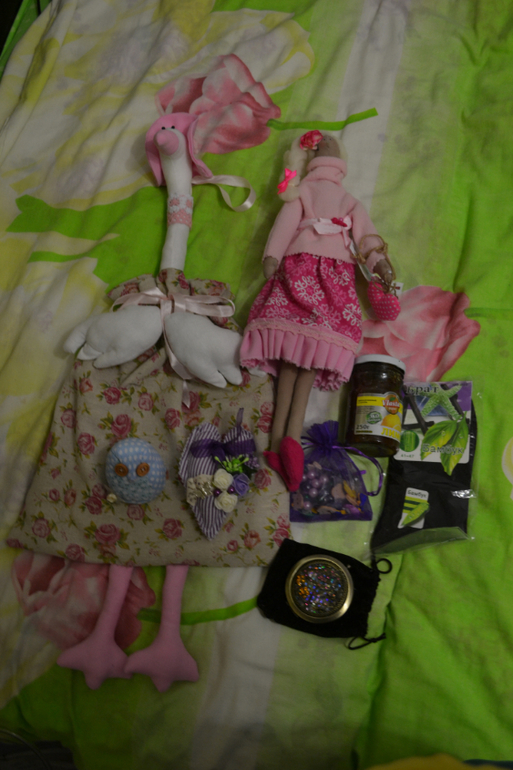 Был у нас обменчик с Юлия . От Юленьки куколка и пакетница, а с нас материал для творчества. Наша посылка еще в пути, а вот нашу мы уже получили. =)))