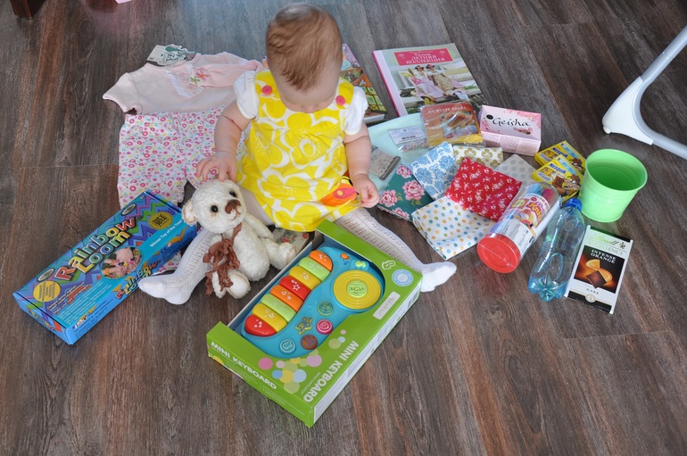 теперь покажу общий вид подарков. доча мне активно помогала их разбирать, приползла и села в самый центр, пришлось вместе с ней фотографировать))
