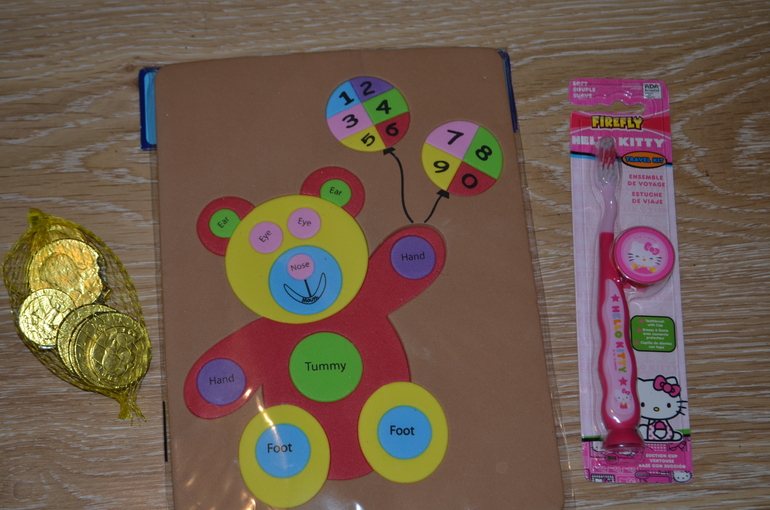 Настюшкины подарочки поближе: пазл-мишка на английском, просто замечательно, т.к. сейчас по-тихонечку вводим английские слова), щеточка с китти и шоколадки-доллары))
