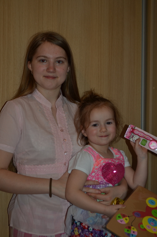 Старшая и младшая с подарочками. У Насти в руках интересный пазл, с английскими словами, чтобы учить где носик, ротик, животик и т.д. А также зубная щеточка с ее любимой китти и шоколадки "доллары")))