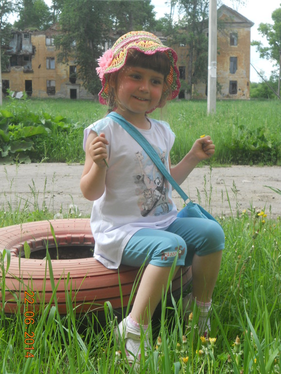 4. Этот в прошлом году показывала, а теперь на ребёнке. Фотка прошлогодняя. Люблю футболочку эту, аппликация чёрно-белая, а на солнце цветная. На задний план внимание не обращаем (гарнизон).
