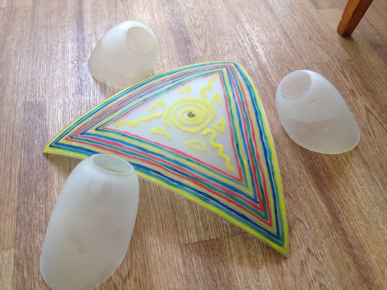 Декор, витражи.Девушки-рукодельницы, помогите советом! Досталась нам от прежних хозяев квартиры убогонькая люстра по наследству. Решили ее оставить, так как новую денег пока нет. Когда я ее стала мыть, вся краска слезла. И вот решила я ее разукрасить. Но не идут в голову идеи. Основной плафон раскрасила, а вот для трех остальных идей нет. Посоветуйте, как можно их развеселить? Спасибо!