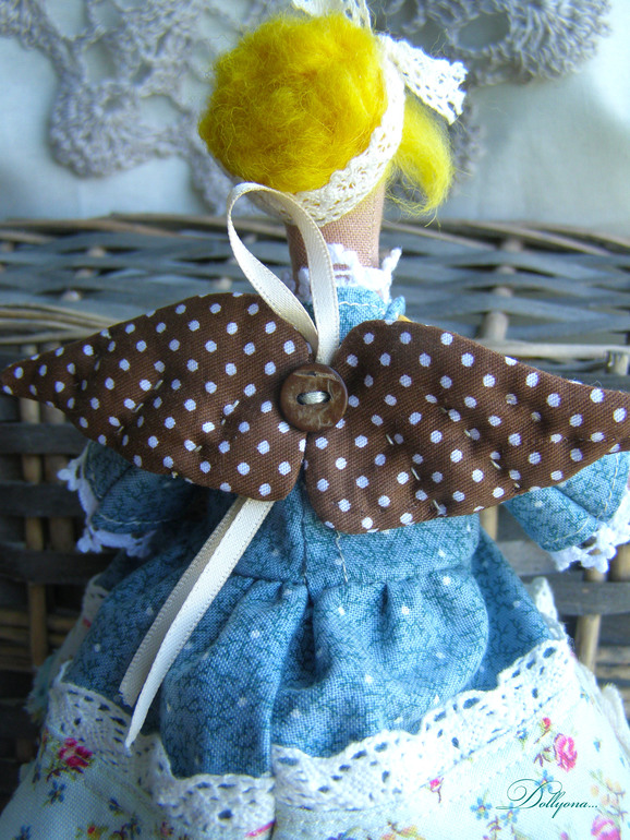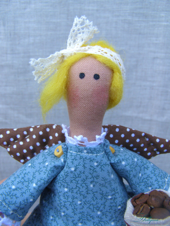 Куколка выполнена из натуральных тканей,хлопка, льна, использовано 6 видов кружев. В руках у феечки мешочек с зёрнами кофе,украшенным мини чайничком. На аппетитной ножке пикантная подвязка).