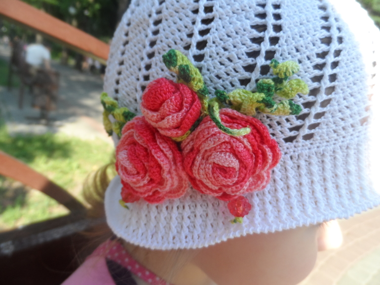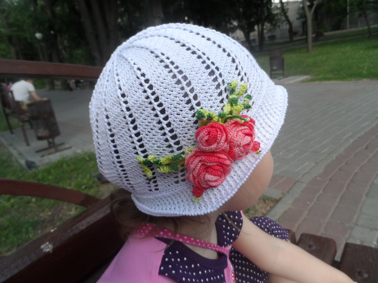 Вот связалась для доченьки, на улице жара, а мы без головного убора ходили. Вязалась долго, но результатом я довольна.