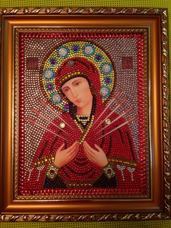 Вот и закончила я икону стразами (было очень интересно попробовать). Фирма - Преобрана, рама к ней также от производителя (без стекла), рама оказалась больше работы, пришлось докупать термоклеевые стразы и пускать еще один ряд по кругу. Также дополнительно был приобретен термопаяльник.