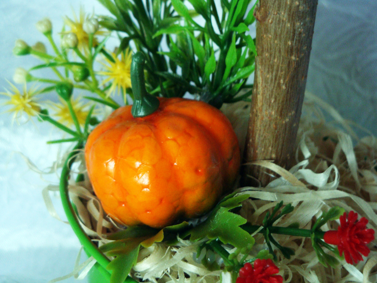 В ведерке солома (деревянная стружка), тыквочка, травка.