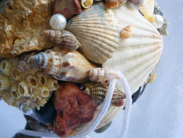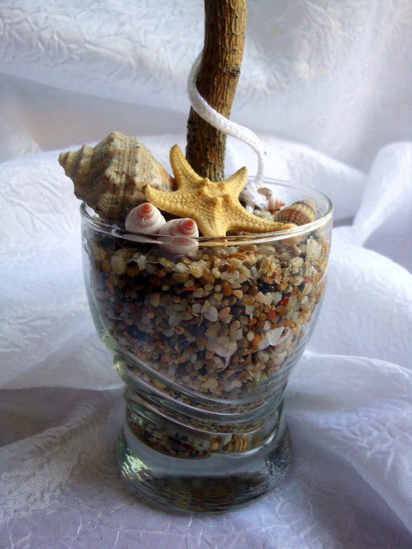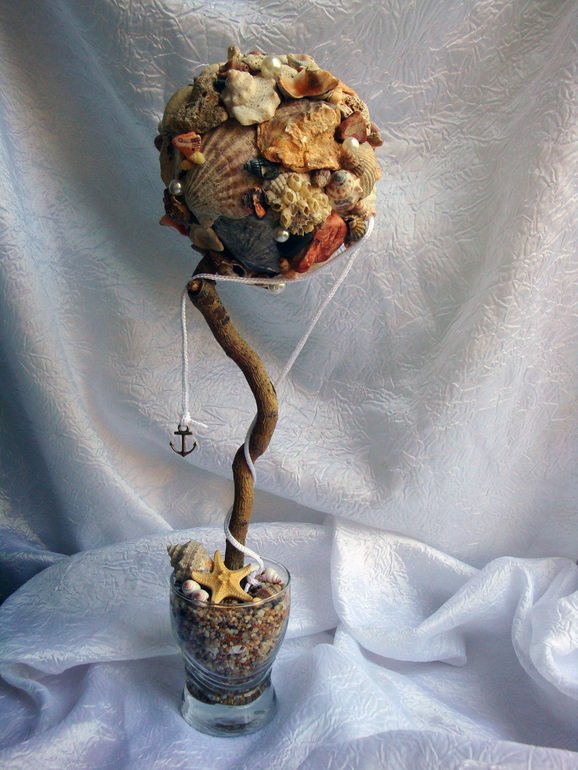 Для работы использовала ракушки, рапаны, камни привезенные в свое время из Крыма. Декорирована крона бусинами, имитирующие жемчуг.