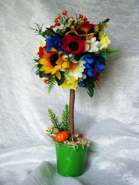 На одну из тематических выставок был создан такой вот топиарий. Хотя с цветами я не люблю работать, работой осталась довольна.