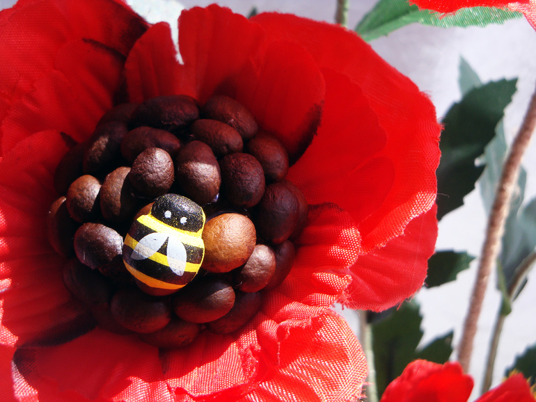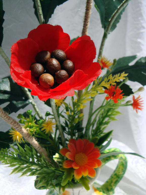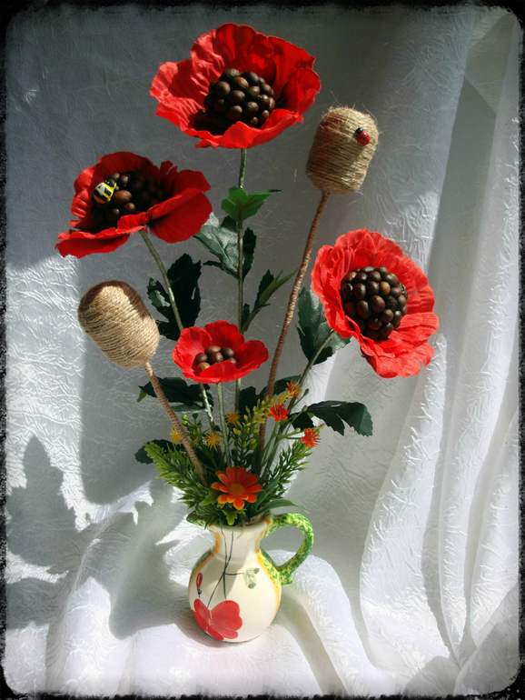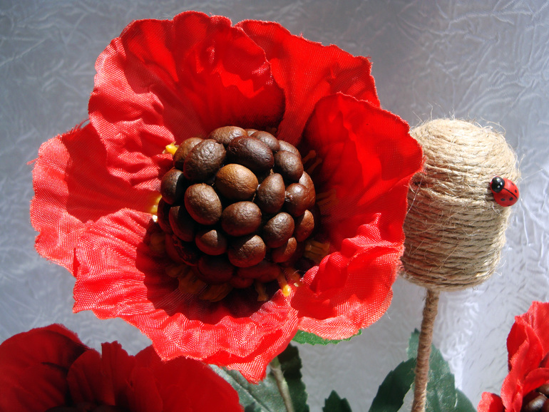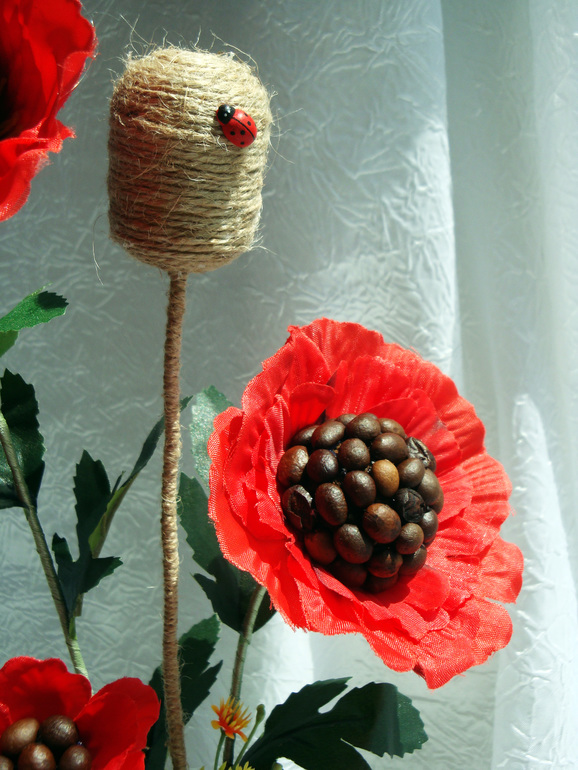 За основу взяла готовые головки маков трех видов, кофейную серединку сделала при помощи контейнеров от киндер-сюрпризов: отрезала меньшую часть, смазала Моментом, приклеила бумажные полотенца, нанесла ПВА и посыпала молотым кофе. Далее при помощи термопистолета на высохшую заготовку приклеила зерна кофе.