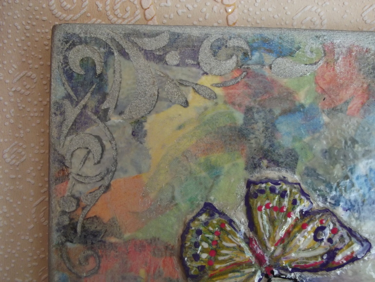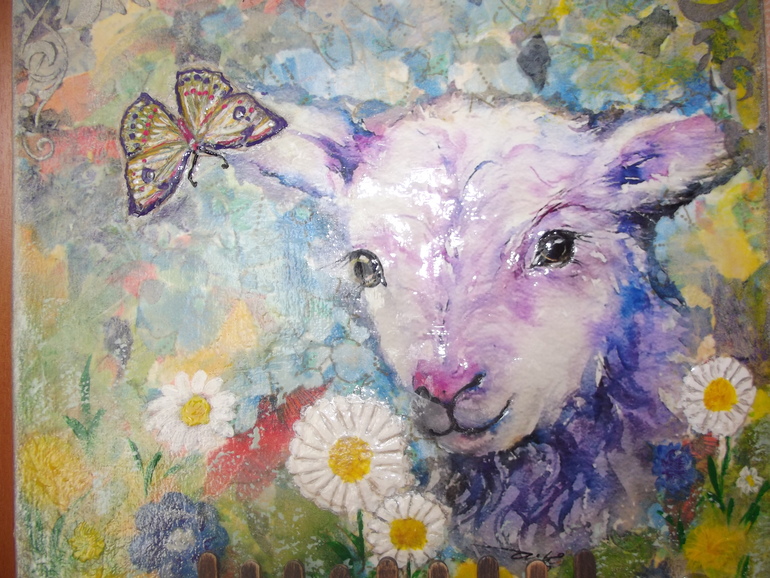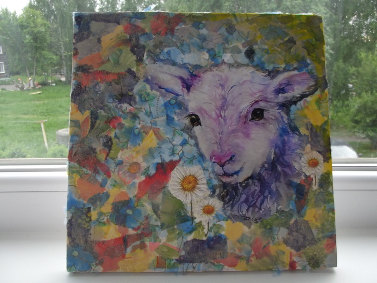 Не решалась с подрисовкой, уши у козы обрезаны и боялась, что не подберу краски в тон.... Выкрутилась с помощью объемного декупажа. Фон - рваные салфетки, цветочки, бабочка и коза выделены с помощью шпаклевки. Пробовала впервые, очень понравилось!