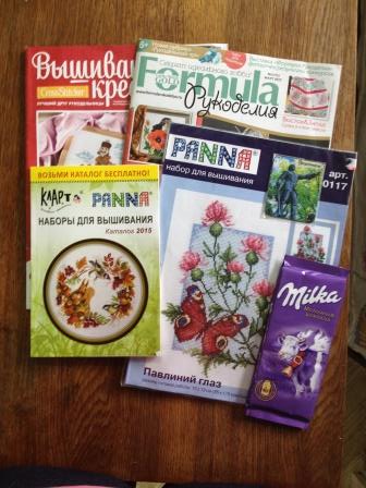 Настя порадовала меня, наборчиком для вышивки от Пана, двумя журналами, каталог Пана, и еще очень вкусной шоколадкой Милка, обожая молочный шоколад)), а еще магнитиком г. Воронеж, за что отдельное огромнейшее спасибо!!! Так приятно получать подарки!!!