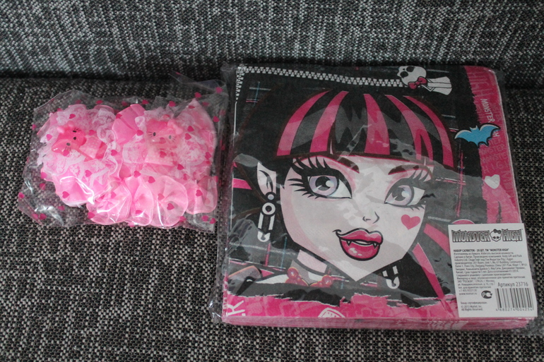 Подарочки для дочки. Пополнение нашей коллекции монстряшек - Катрин Де Мяу. Очень ее ждали. Салфеточки, резиночки и тепленькое платье ручной работы. Платье очень нежное.