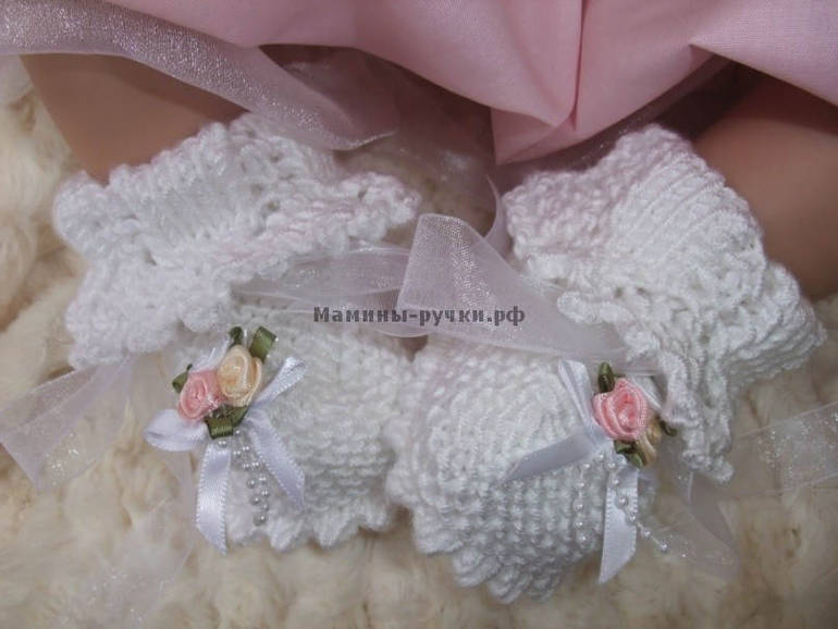 Замечательный комплект для новорожденной малышки. Края кардигана и шапочки выполнены в форме лепестков, а нежные пинетки прекрасно дополняют этот комплект. Этот прекрасный комплект не так сложно вязать, как может показаться, если следовать описанию.