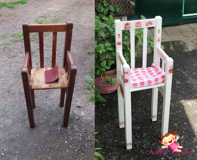 ДекупажЭтому стульчику лет 27 точно есть, его папа делал для меня из детской кроватки, потом в нем выросли мои племянники. В последние годы стул служил подставкой под ведро воды... Теперь у меня маленькая дочь и стулу суждено послужить и ей...