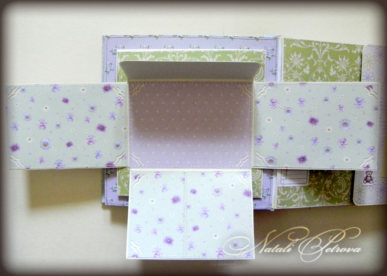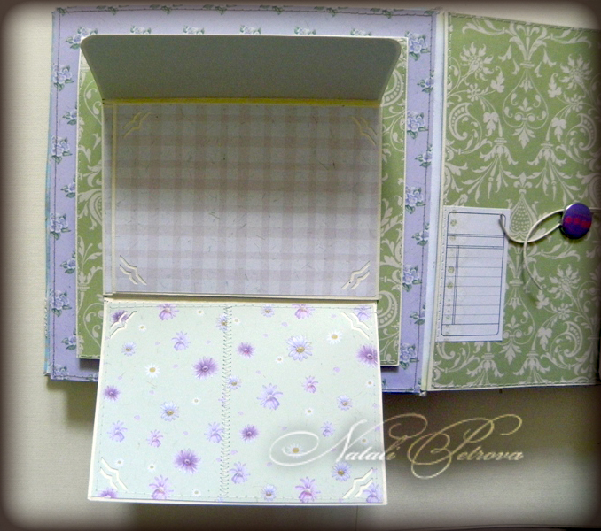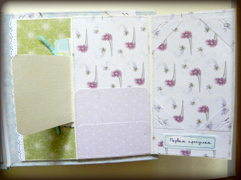 Т. к. переплет делала давно и для другого оформления, то все странички уже были обклеены бумагой, прорези уже не сделать как у Вероники. Кусочек бумаги с цветочками следовало заменить на зеленую.