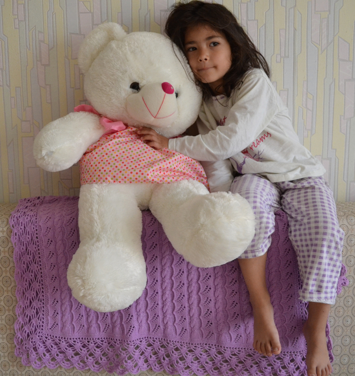 а это моя звезда, попросила ее с мишкой на "на одеяльце" сфотать. Раннее утро, поэтому в пижаме и без макияжа)))))