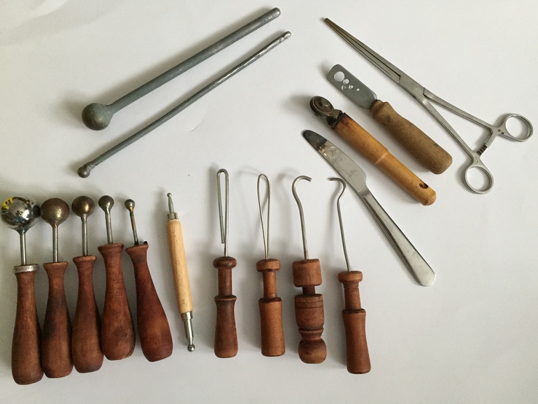 Бульки (первые 5 слева) это подшибники от велосипеда, машины, трактора, которые мой папа приварил к железным стержням и приделал деревянные ручки (ножки старой советской этажерки). Две самые маленькие бульки (2 в 1) я купила уже в Германии и предназначаются они изначально для выдавливания узоров на фольге.