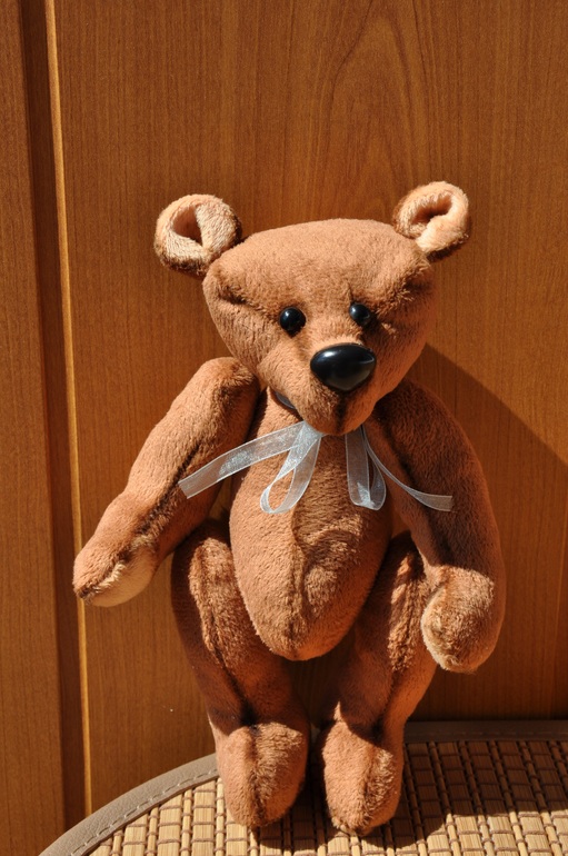 Сшит из плюша, набит опилками, шплинтовые крепления, тонирован маслом. На шедевр не претендую)) Очень давно мечтала сшить теддика, долго к этому шла)) Пусть он такое вот немного неуклюжий вышел, но мне так он нравится, наверное потому что первенец))