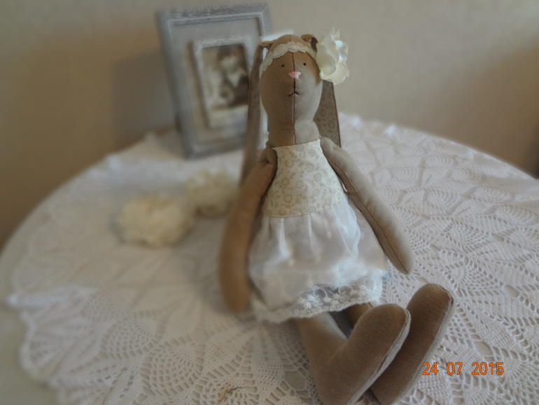 Немного отвлеклась от шитья мишек тедди и сшила зайку в стиле тильда.На мой взгляд она получилась такой милой и нежной и ростик не маленький,целых 40см.Ручки у зайки подвижны,на нитяном креплении. Зайка одета в праздничное платье из хлопка и тонкого кружева,и белые панталончики,а на голове нарядный ободок))).