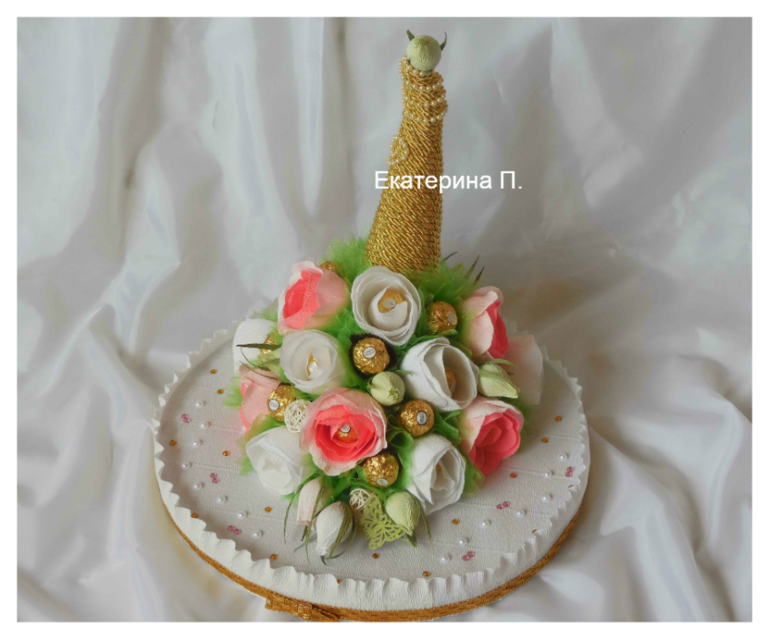 Диаметр основания 40 см на 40 см, высота 37 см. Состав: конфеты Ферреро Роше, Европейская коллекция, флор. материалы, органза, золотой шнур, бусины, полубусины, стразы, декоративная лента, декоративная бабочка, шарики из ротанга.