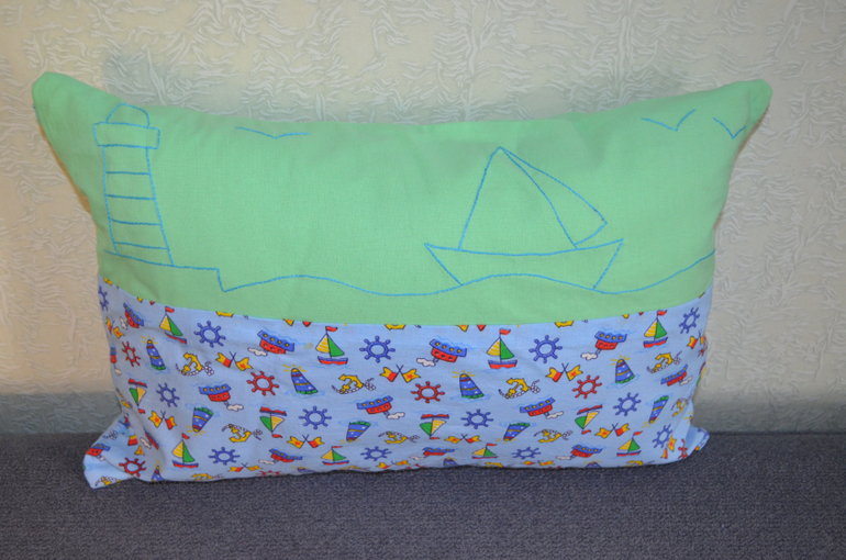 Для подушки чего только не перепробовала - в плате сочетания тканей. Вышивка на ткани с рисунком мне не понравилась, поэтому