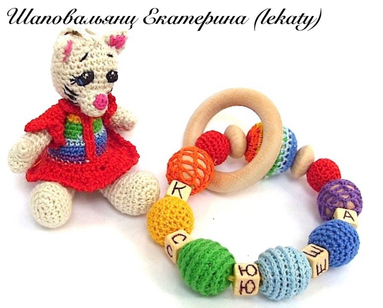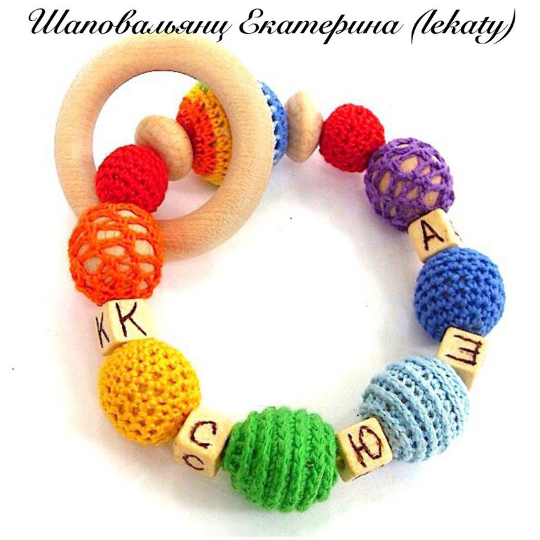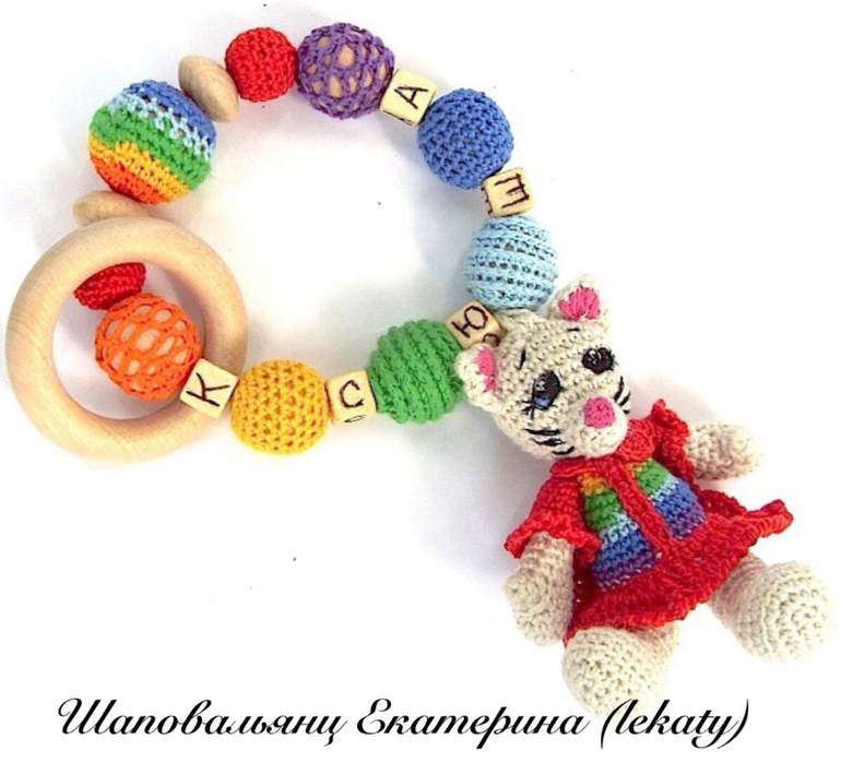Связался на заказ вот такой грызунок для малышки Ксюшечки) Кошечку-погремушку можно снять и использовать отдельно. В грызуночке использованы несколько видов обвязки бусин, бусины разные по форме и размеру. Буквы выжжены по дереву вручную. Материалы: деревянные бусины (гипоаллергенные, без запаха), деревянное колечко ( береза), хлопковая пряжа, холлофайбер (мягкие части кошечки), погремушка. Под катом отдельные фото
