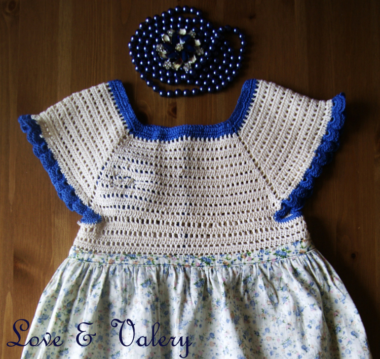 Шитье одежды, выкройки, ремонт одежды, шторы, швейные машины (уже приобретенные)Яркое платье в комбинированном стиле выполнено из тонкой хлопковой пряжи (крючком №1,25): цветом экрю выполнено основное полотно топа, синим васильковым обработаны горловина, проймы и низ топа, по нижнему краю изделия пришита тесьма с фестонами. Топ декорирован синей розой с крупной белой бусиной с переливами. Застежка на спинке - 3 пуговки. Низ изделия выполнен из хлопковой итальянской ткани с мелким цветочным принтом. Внутренний шов закрыт планкой из этой же ткани (последнее фото).