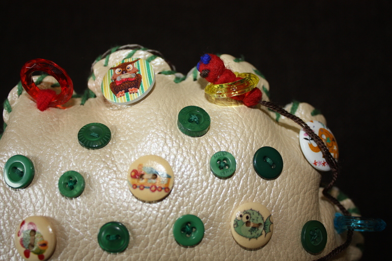 Теперь оборотная сторона дерева.. Там пришиты красивые веселые пуговки и плюс колечки для шнуровки. На стволе в кармашке живет гусеничка, кот и путешествует по этим колечкам. Она сваляна из отдельных шариков, кот потом вместе скреплены между собой ниткой для самой шнуровки. Гусеничка получилась очень маленькая и плотная, что облегчает процесс самой шнуровки. Вот фото..