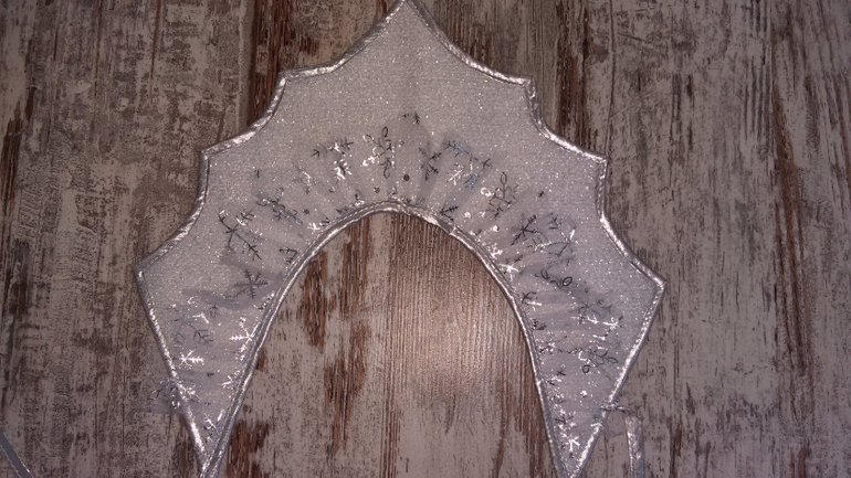 Не знаю что сделать с самим белым фоном на платье, думала вышить бисером, но сама ткань имеет фактуру мелкой травки, не очень плотная и что то объемное вышивать будет тяжеловато. А что то редкое из бисера даже представить не могу... Думала еще может из ткани какие то цветы мелкие и средние а потом собрать в композицию и уже веточки в виде морозного узора из бисера вышить. Но единая картинка в голове пока не укладывается. Помогите пожалуйста советом, буду вам очень благодарна. А еще с кокошником что делать не знаю он на плотном флизелине форму держит с трудом.