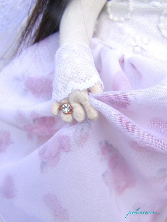 Невеста нежная...милая...трогательная.. Первую её головушку пришлось забраковать..по выражению личика...и делать заново)). Сшита из индийского не беленного хлопка. Наряд весь легко снимается и состоит из: обувки ручной работы, кружевных чулок, подвязки, нижнего белья, нижней юбки, платья с декольте и многослойной юбкой, трёхслойной фаты и митенок. Очень нежное, пышное платье...акцент в образе сделан на розы. Украшения и цветы в веночке и букете невесты ручной работы. Пальчики все сгибаются и могут держать лёгкие предметы. Личико расписано акрилом по ткани, маслом и пастелью. Волосы крепко пришиты, можно создавать прически). Сидит и стоит самостоятельно. Ростик около 32см. Сшита малышка для свадебного салона).