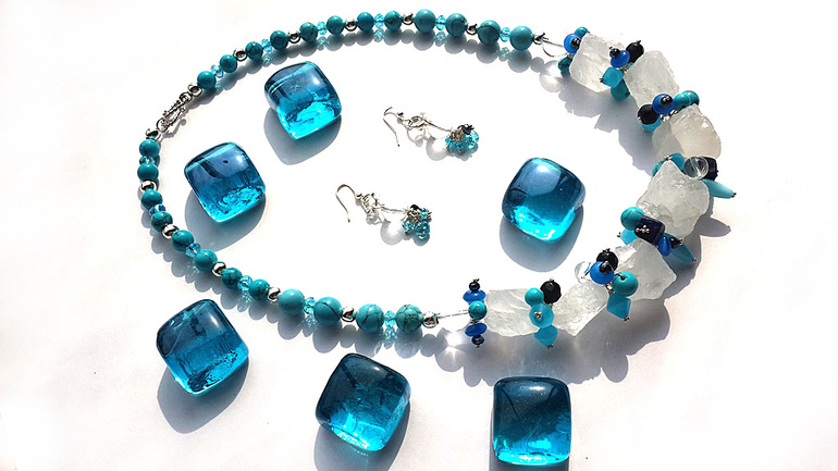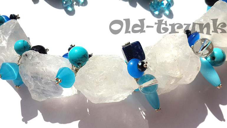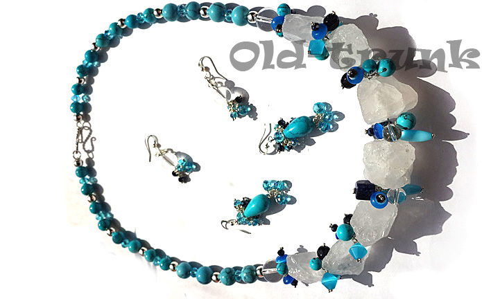Турквенит под бирюзу, стекло всех оттенков синего, лазурит, горный хрусталь, штифты и швензы серебро. Надеюсь хозяйке понравится.
