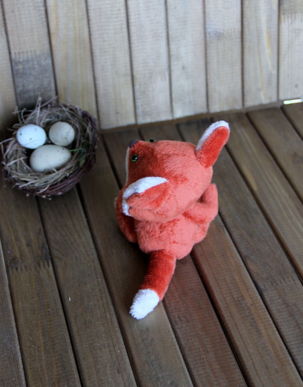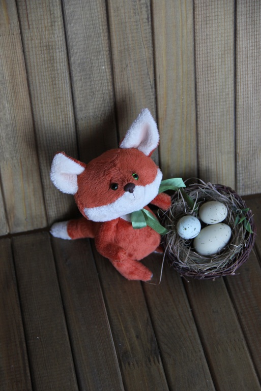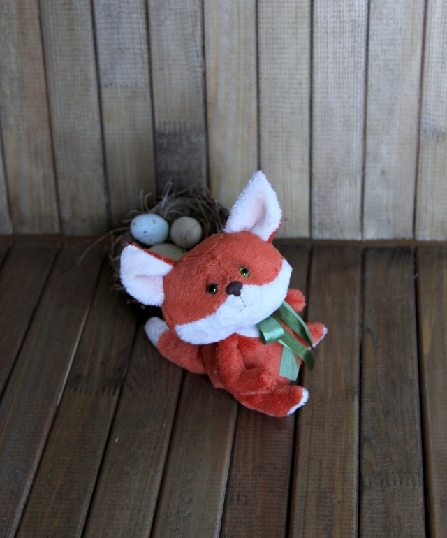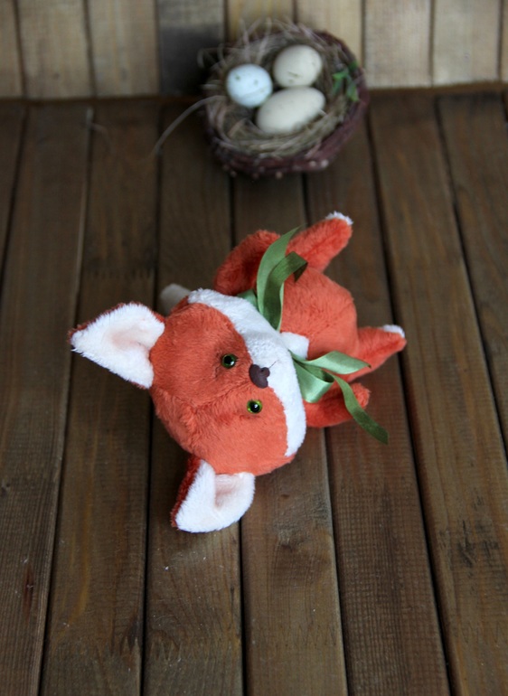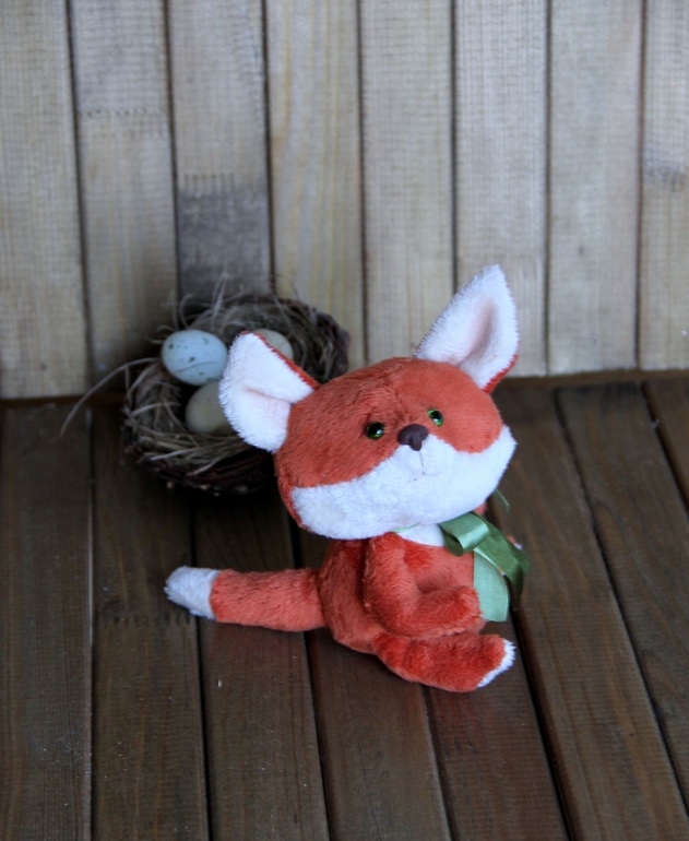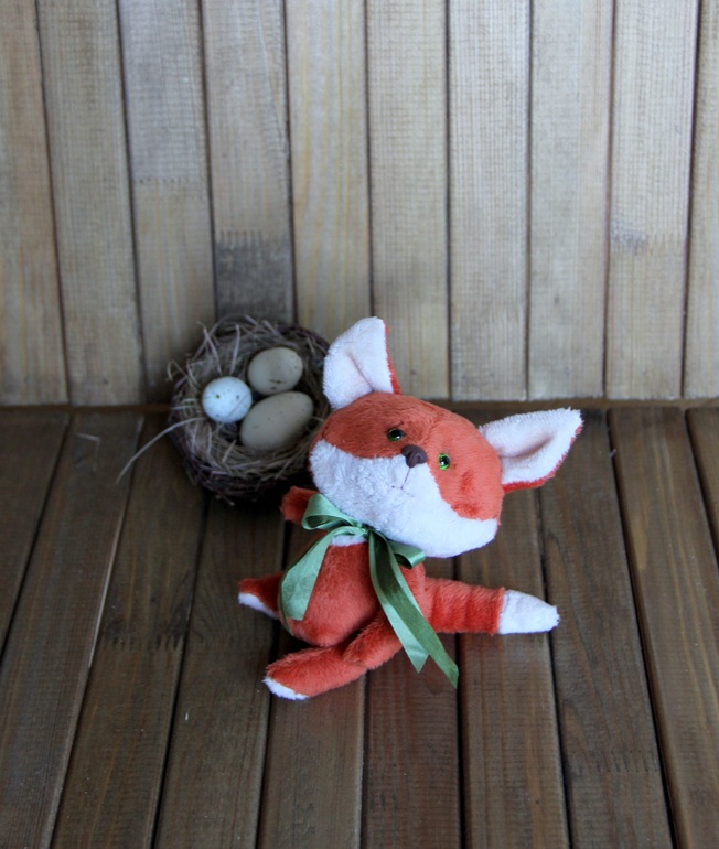 Игрушечный мир - животныеЛисенок из мягкого плюша мандаринового цвета - небольшой мягкий друг. Ростом 13 см, сидя 11 см. без учета ушек. Удивленная мордочка, хвост морковкой, зеленые глазки и изумрудные шелковые ленточки на шее.
