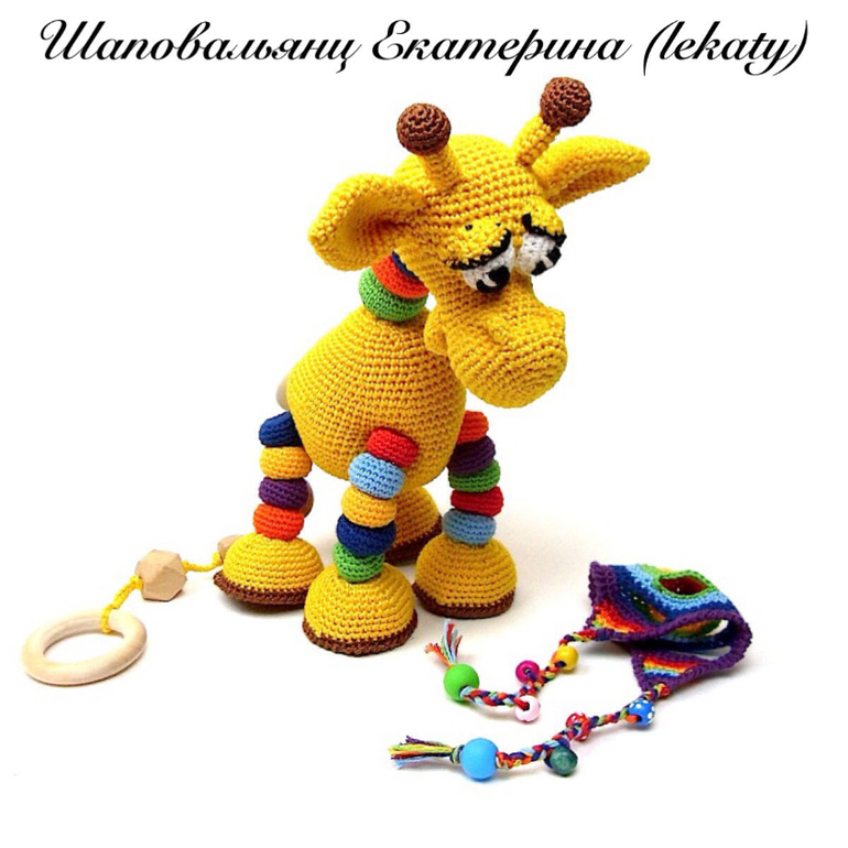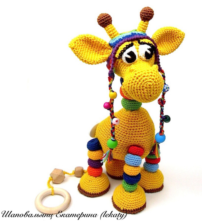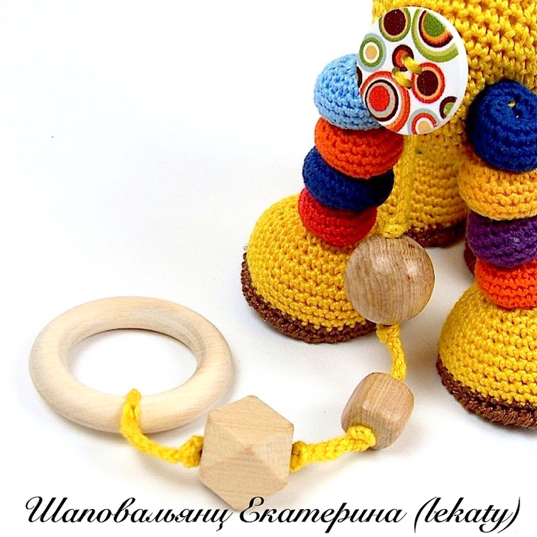 По желанию заказчицы, жирафик не имеет челочки, а хвостик выполняет функцию грызунка), при чём в хвостике имеются разные по форме бусинки, круглая, квадратная и многогранная, а на конце - деревянное кольцо- прорезыватель.