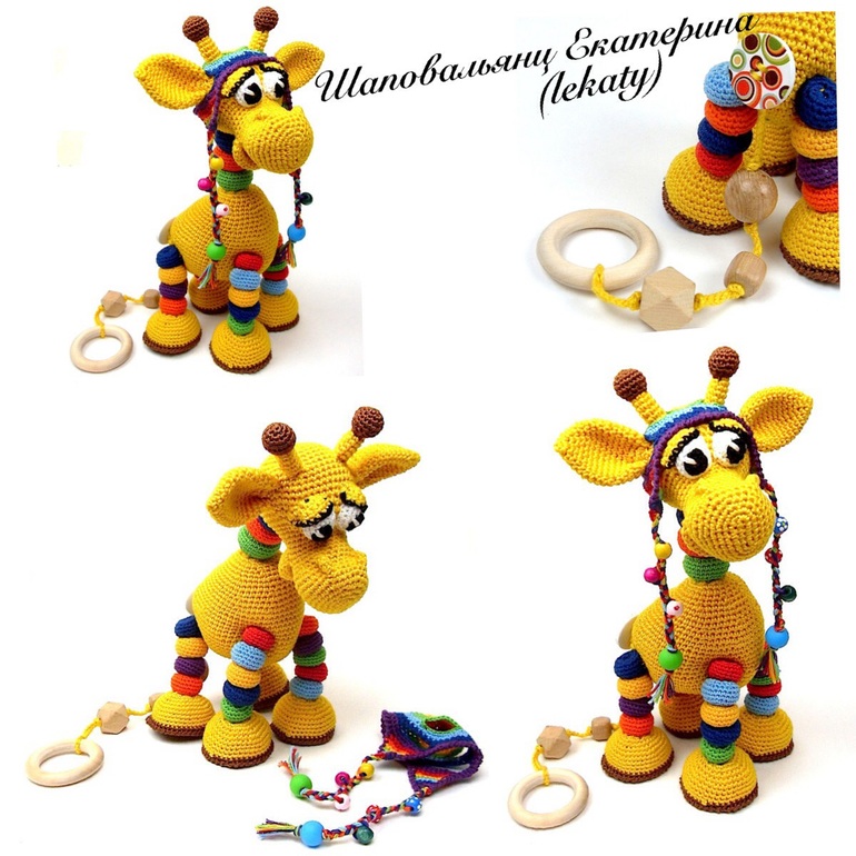 У него нет челочки и пушистого хвостика из шнурочков, но зато имеется радужная шапочка-ушаночка, в завязочках которой имеются различные бусины по материалам (деревянные и силиконовые) и по размеру. Ушки у жирафа шуршат, ножки разные: одна гремит, вторая шуршит, третья мягенькая, а в четвертой - гранулят, гранулы которого очень приятно перекатываются под пальчиками. Носик жирафа пищит, в рожках деревянные бусины.Такая игрушка стимулирует развитие мелкой моторики, познакомит малыша с такими понятиями, как форма, размер, цвет. Поможет развить пространственное восприятие, воображение, память, мышление, внимание и звуковосприятие (благодаря шарикам-погремушкам, шуршалкам и пищалкам).