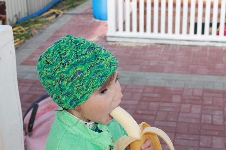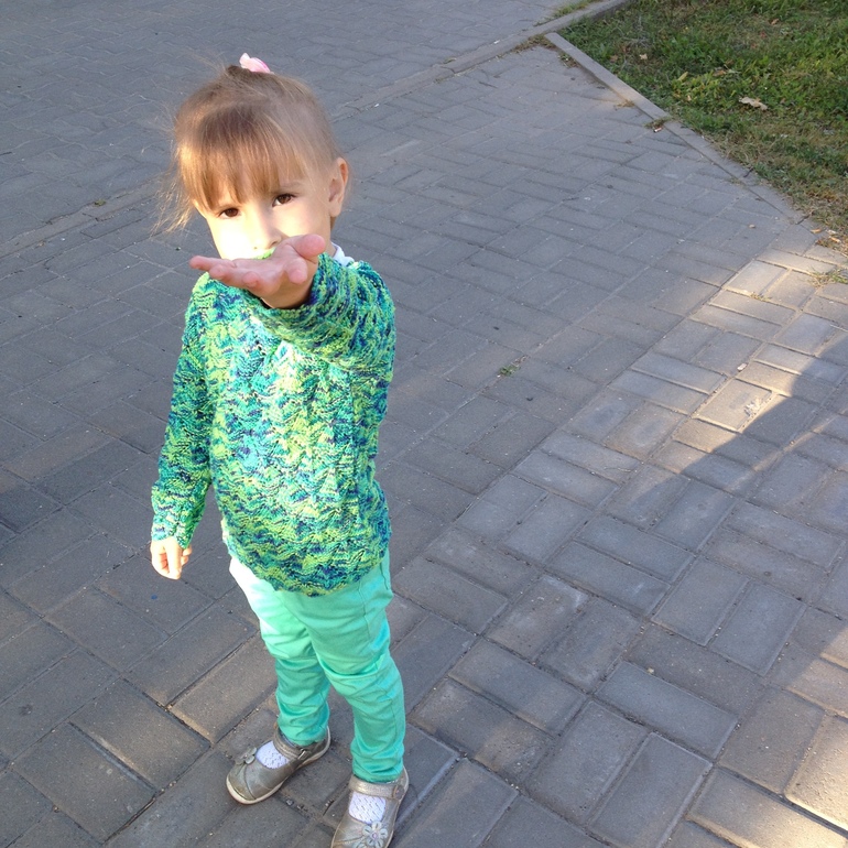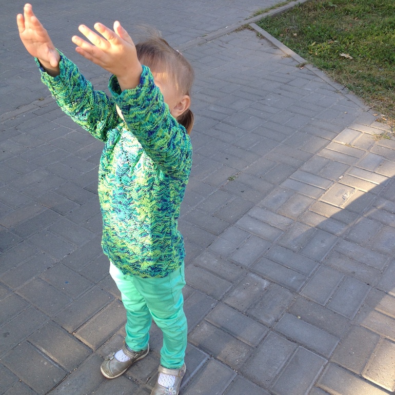 Увидела я в магазине пряжу и влюбилась в расцветку. Купила ее и сразу вязать...Вначале хотела только свитерок для дочи под брючки, но наша обновочка оказалась такой уютной, что мы носим подо все. А из остаточков шапочка для холодных вечеров. Под катом много фото.