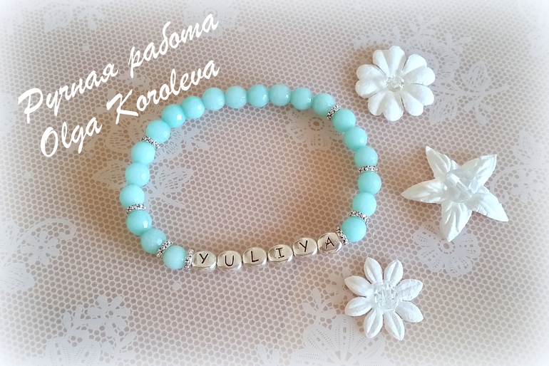 Бижутерия для слингомам. Слингобусы. Грызунки.Нежный тонкий браслет с именем из тонированного агата мятного цвета.