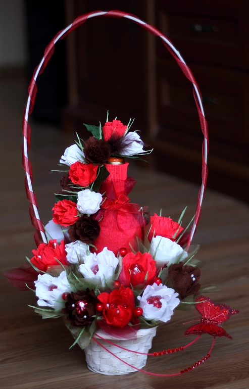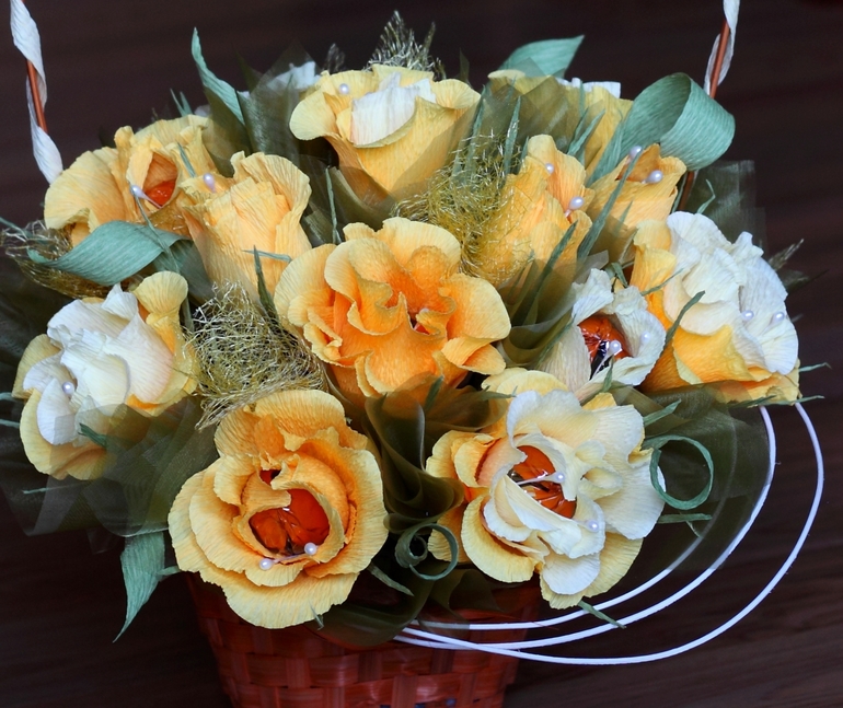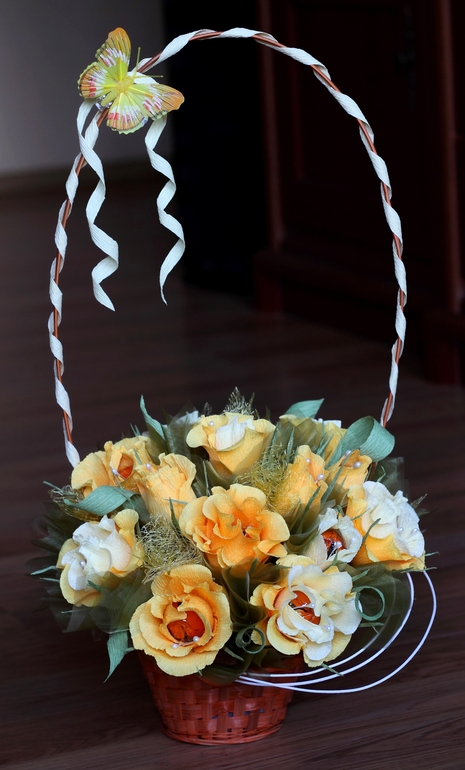 Катя, спасибо Вам огромное за комментарий. Да, это розы по задумке. Цветы в первой корзине наверно можно назвать "экспериментальными" в самой сборке, но конфеты в обеих работах одной формы и размера :) А зелень и мелкоцвет обязательно буду пробовать добавлять.