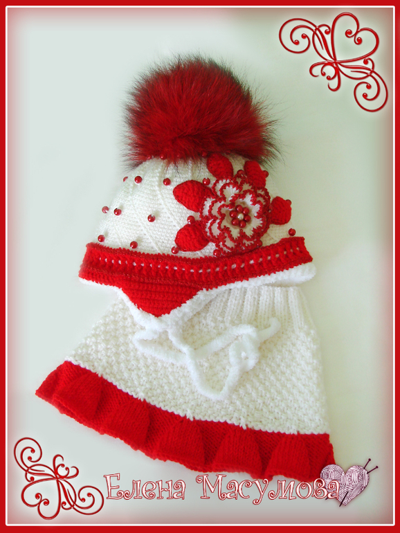 15. Комплект - шапочка и манишка. Пряжа Нако Бамбино и Ализе Софти. Помпон из чернобурки съемный.
