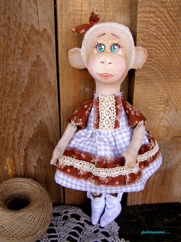 . Одно издательство предложило мне сделать мк по моей обезьянке Лесе...Пока я его делала...повторить саму себя у меня не получилось)) сшилась обезьянка Рози )) немного в стиле шебби. Розы и шоколад. В платьице из американского хлопка и хлопкового кружева . На ножках кружевные носочки. Панталончики из тончайшего хлопка...Платъишко несъёмное. Личико расписано маслом и акрилом. Может сгибать ножки и ручки. Сидит, забавно свесив ножки.Ростик 30см. Показала мужу ..говорит на Обаму похожа)). Сорри мистер президент